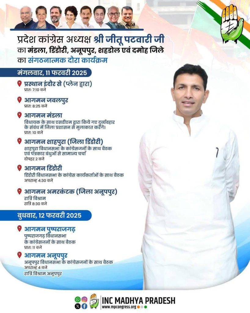 प्रदेश कांग्रेस अध्यक्ष श्री जीतू पटवारी जी 11 फरवरी 2025 को इंदौर से प्रस्थान करेंगे। उनका विमान सुबह 7:10 बजे उड़ान भरेगा और वे प्रातः 8:25 बजे जबलपुर पहुंचेगें। जबलपुर आगमन के बाद, वे मंडला विधायक के साथ एसडीएम द्वारा किए गए दुर्व्यवहार के संदर्भ में जिला प्रशासन से मुलाकात करेंगे, ताकि मामले की जांच की जा सके और न्याय सुनिश्चित हो सके।