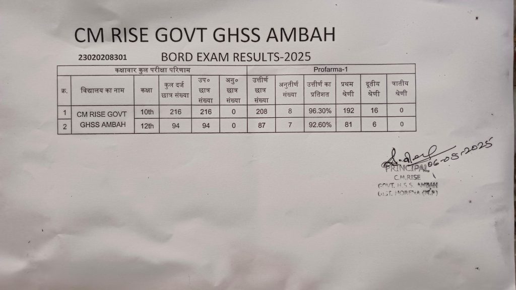 माध्यमिक शिक्षा मंडल, भोपाल द्वारा घोषित हाई स्कूल एवं हायर सेकेंडरी बोर्ड परीक्षा 2025 के परिणामों में सांदीपनि शासकीय उत्कृष्ट उच्चतर माध्यमिक विद्यालय, अंबाह ने बेहतरीन प्रदर्शन करते हुए एक बार फिर अपनी शैक्षणिक श्रेष्ठता को सिद्ध किया है।