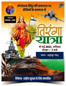 ऑपरेशन सिंदूर में भारतीय सेना के अदभुत पराक्रम और पाकिस्तान को मुँह तोड़ जवाब देने के लिए उनके शौर्य व वीरता के सम्मान में अनुपपुर जिले के लोग तिरंगा यात्रा के माध्यम से सम्मान करेंगे ।