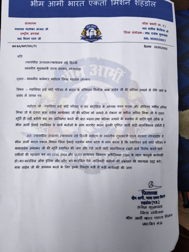 भीम आर्मी भारत एकता मिशन, ज़िला इकाई शहडोल ने इस मामले में सख़्त नाराज़गी जताते हुए सुप्रीम कोर्ट के न्यायमूर्ति तथा मध्यप्रदेश सरकार से गुहार लगाई है कि दोषियों के विरुद्ध SC/ST अत्याचार निवारण अधिनियम, धारा 153A एवं 295A के तहत तत्काल कानूनी कार्यवाही की जाए। साथ ही, उन्होंने बार काउंसिल ऑफ इंडिया से मांग की है कि ऐसे जातिवादी मानसिकता वाले वकीलों की वकालत की मान्यता रद्द की जाए।