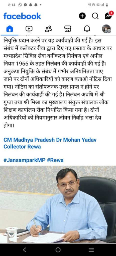 लंबी जद्दोजहद के बाद फर्जी अनुकम्पा नियुक्ति मामले में जिला शिक्षा अधिकारी रीवा सुदामा लाल गुप्ता और योजना अधिकारी अखिलेश मिश्रा पर निलंबन की गाज गिरी है।वही सहायक संचालक राजेश मिश्रा पर फिलहाल कोई कार्यवाही नहीं की गई है।गौरतलब है कि बृजेश कोल को फर्जी अनुकम्पा नियुक्ति दिए जाने की खबर सबसे पहले मेरे द्वारा लिखी गई थी,जिसकी गूंज भोपाल तक हुई थी।बाद में पिछले एक वर्ष के सभी अनुकम्पा नियुक्ति मामलों की जांच कराई गई जिसमें बड़ा फर्जीवाड़ा सामने आया था।अंततः खबर का असर हुआ और दो बड़े अधिकारियों का निलंबन हुआ।