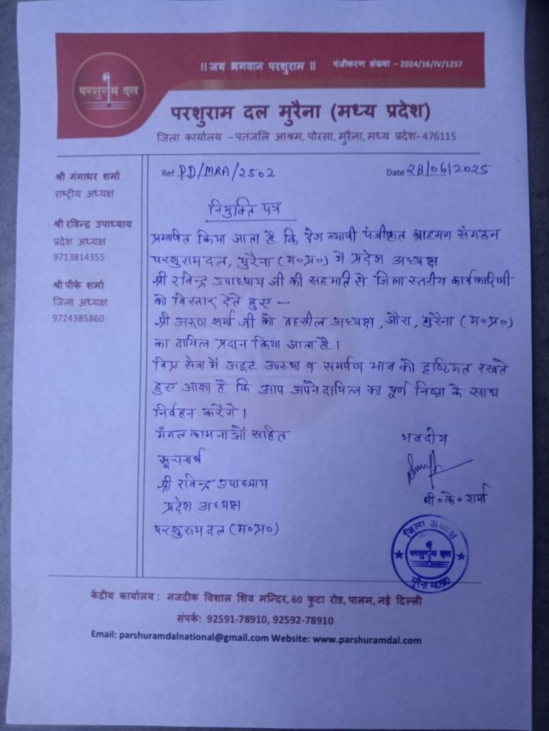 यह नियुक्ति परशुराम दल मुरैना के जिला कार्यालय, पतंजलि आश्रम, पोरसा से जारी की गई। संगठन के प्रदेश अध्यक्ष रविन्द्र उपाध्याय की सहमति और दिशा-निर्देशन के अंतर्गत यह दायित्व सौंपा गया। नियुक्ति पत्र जिला अध्यक्ष पी.के. शर्मा द्वारा हस्ताक्षरित और जारी किया गया, जिसका संदर्भ क्रमांक PD/MRA/2502 है।