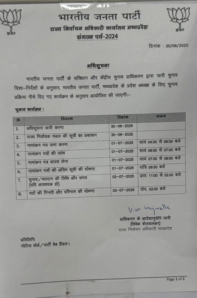 भारतीय जनता पार्टी, मध्यप्रदेश में संगठन पर्व-2024 के अंतर्गत प्रदेश अध्यक्ष पद के चुनाव की आधिकारिक अधिसूचना आज दिनांक 30 जून 2025 को राज्य निर्वाचन अधिकारी विवेक शेजवलकर द्वारा जारी की गई। यह प्रक्रिया पार्टी के संविधान और केंद्रीय चुनाव प्राधिकरण द्वारा जारी दिशा-निर्देशों के अनुरूप संचालित की जाएगी।