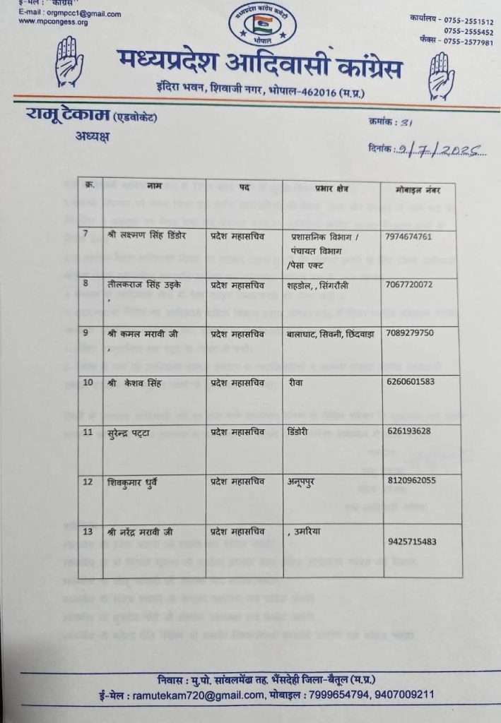 यह नियुक्ति प्रदेश अध्यक्ष रामू टेकाम के मार्गदर्शन और अखिल भारतीय आदिवासी कांग्रेस के राष्ट्रीय अध्यक्ष डॉ. विक्रांत भूरिया, मध्यप्रदेश कांग्रेस कमेटी अध्यक्ष जीतू पटवारी, वरिष्ठ नेता अजय सिंह ‘राहुल भैया’ और कमलेश्वर पटेल के निर्देशानुसार की गई है।