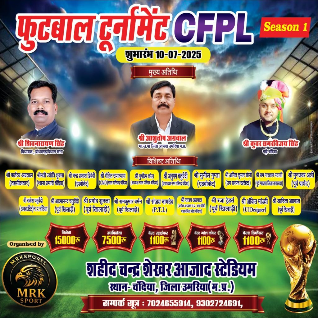 CFPL टूर्नामेंट का यह समापन मैच केवल खेल नहीं, बल्कि स्थानीय युवाओं की प्रतिभा, टीम भावना और खेल संस्कृति का उत्सव है। अनूपपुर और शहडोल की टीमों के बीच होने वाला यह फाइनल निश्चित रूप से दर्शकों को रोमांच से भर देगा।