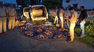 गाडरवारा । पुलिस मुख्यालय के निर्देश पर नियम विरूद्ध वाहन चलाने वालों के विरूद्ध कार्यवाही करने हेतु चलाए जा रहे विशेष अभियान के तहत विगत दिवस रात्रि में जिले के संपूर्ण थाना क्षेत्रों में पुलिस अधीक्षक, डॉ. ऋषिकेश मीना के निर्देश पर वाहन चैकिंग लगायी गयी थी। थाना गाडरवारा पुलिस की प्रभावी कार्यवाही सर्विंग अभियान के तहत प्रभावी कार्यवाही की गयी जिस पर पुलिस टीम को सांईखेड़ा तरफ से आकर आमगांव नाका गाडरवारा होते हुए शक्कर नदी पुल पार करेली तरफ जाते हुए एक संदिग्ध स्कॉर्पियों जो कौडिया के पास पलट गयी थी जिसकी तलाशी लेने पर जप्त अवैध शराब की मात्रा देशी देशी मसाला एवं प्लेन शराब की कुल 36 पेटी शराब कुल 329 बल्क लीटर, शराब कीमती लगभग 2 लाख 13 हजार रूपये, जप्त तस्करी में प्रयुक्त वाहन