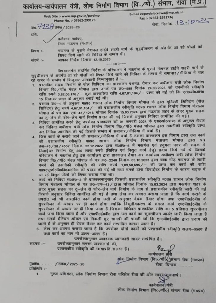 मऊगंज जिले में लोक निर्माण विभाग का एक और चौंकाने वाला मामला सामने आया है। विभाग के द्वारा जारी किया गया पत्र खुद इस बात की तस्दीक कर रहा है कि अब विभाग जनता को गुमराह करने में माहिर हो चुका है।