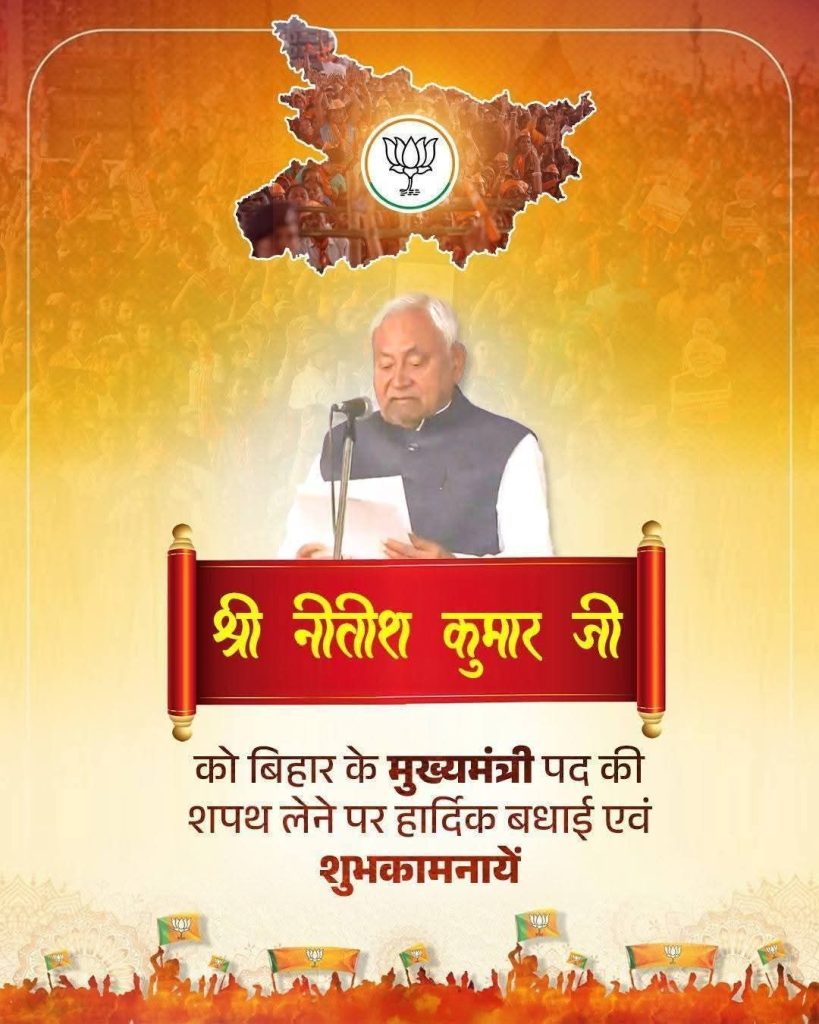 बिहार के मुख्यमंत्री के रूप में शपथ ग्रहण करने पर आदरणीय श्री Nitish Kumar  जी को हार्दिक बधाई।