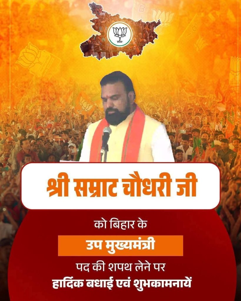 राज्य के उप मुख्यमंत्री की शपथ लेने पर श्री Samrat Choudhary   एवं श्री VIJAY KUMAR SINHA   जी एवं मंत्री पद की शपथ लेने वाले सभी जनप्रतिनिधियों को बधाई और सफल व प्रभावी कार्यकाल के लिए शुभकामनाएँ देती हूँ।