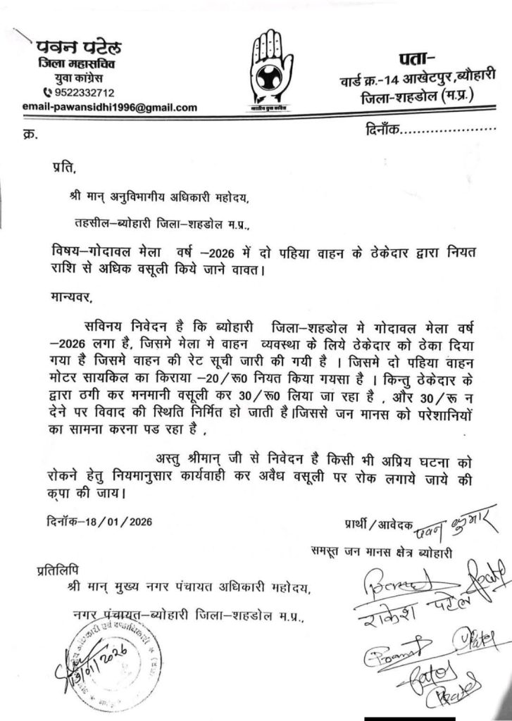 दूर दराज से सायकिल, मोटर सायकिल से आने वाले लोगों को वाहन खड़े करने की सुविधा नगर परिषद द्वारा दी जाती है जिसका शुल्क नगर परिषद् ब्यौहारी द्वारा निर्धारित कर वसूली कि जिम्मेदारी ठेकेदार को दी गई, पर ठेकेदार द्वारा अपने कर्मचारियों से निर्धारित दर से ज्यादा की वसूली कराई जाती है जिसकी शिकायत पत्र के माध्यम से युवा कांग्रेस जिला महासचिव पवन पटेल द्वारा एस डी एम ब्यौहारी को आवेदन देकर कार्यवाही की मांग की गई है जिससे कोई अप्रिय घटनाएं न घटे।