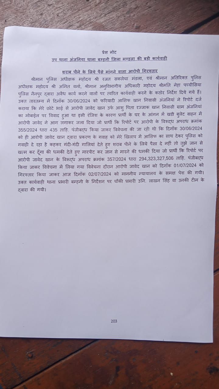जानकारी अनुसार दिनांक 30/ 6/ 2024 को अंजनिया निवासी और फरियादी आसिफ खान नें पुलिस चौकी में पहुंच ये रिपोर्ट दर्ज कराई थी कि उसके छोटे भाई से आरोपी जावेद खान उर्फ आशु पिता रज्जाक खान निवासी ग्राम अंजनिया का मोबाइल फोन पर विवाद हुआ था l इसी रंजिश को लेकर प्रार्थी के घर के आँगन में खड़ी बुलेट वाहन में आरोपी जावेद ने आग लगाकर जला दिया l जहां पुलिस के द्वारा प्रार्थी की रिपोर्ट पर आरोपी के विरुद्ध अपराध क्रमांक 355 / 2024 धारा 435 ताहि पंजीबदध किया l