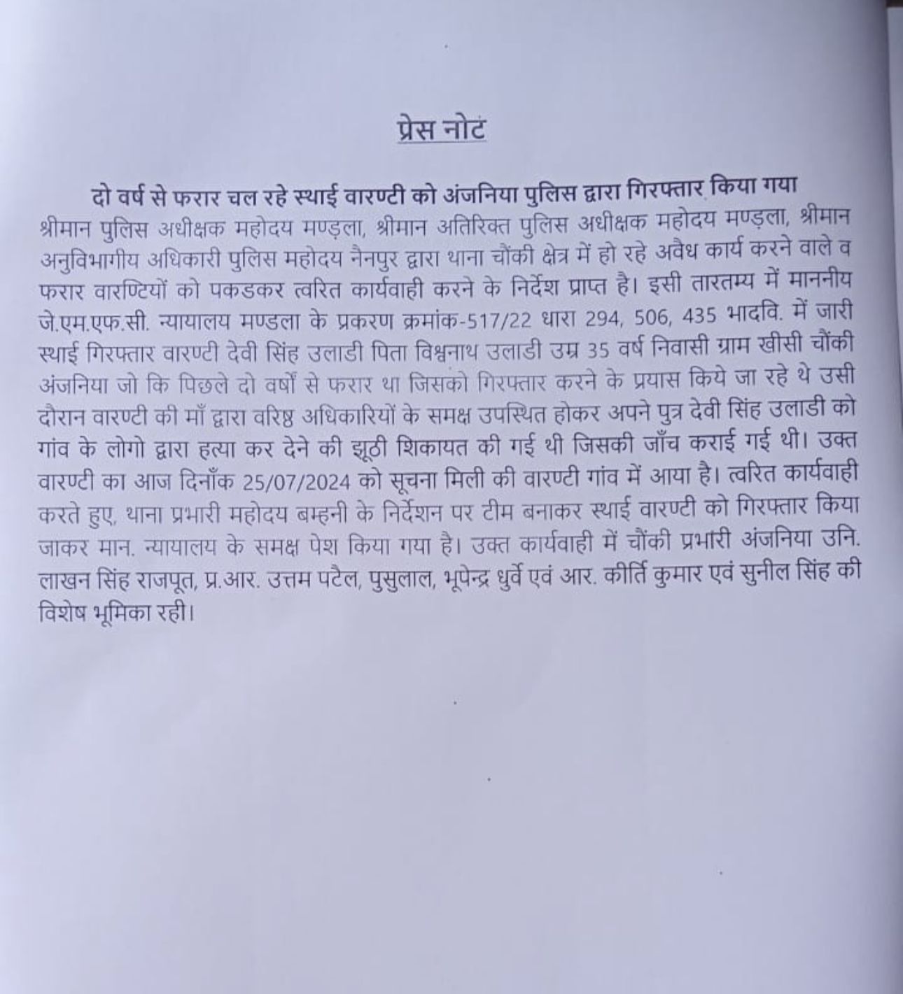 इसी दौरान अंजनिया पुलिस को मुखबिर से सूचना प्राप्त हुई कि वारंटी गांव आया हुआ है जहाँ पुलिस बिना कुछ देरी किए बिना उसके गांव पहुंची और उसे गिरफ्तार कर चौकी लेकर आई l जहां न्यायालय में पेश कर जेल भेज दिया गया l