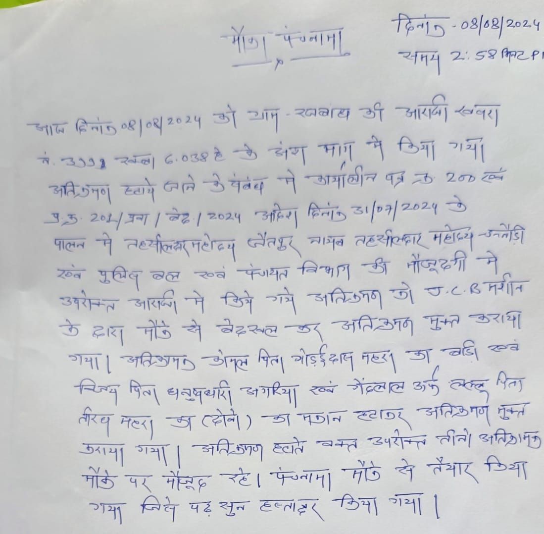दिनांक 08 /08/2024 को समय 2:58 पी. एम. पर ग्राम रजबांध की अराजी खसरा नं. 399 रकबा 6.038 हे. के अंश भाग में किया गया अतिक्रमण हटाये जाने के सम्बन्ध में कार्यालीन पत्र क्रमांक 200 एवं प्र. क्र. 201/ प्र वा/बन्द/2024 आदेश दिनांक 31/07/2024 के पालन में तहसीलदार जैतपुर ,नायब तहसीलदार चन्नौडी ,पुलिस बल केशवाही, एवं पंचायत विभाग की मौजूदगी में उपरोक्त अराजी में किए गए अतिक्रमण को जे.सी.बी.मशीन के द्वारा मौके से बेदखल कर ,अतिक्रमण मुक्त कराया गया । अतिक्रामक कोमल पिता गोडई दास महरा का बाडी, विजय पिता धनुषधारी अगरिया एवं गेंद लाल उर्फ लल्लू पिता तीरथ महरा का दोनों का मकान हटा कर अतिक्रमण मुक्त कराया गया। अतिक्रमण हटाते वक्त उपरोक्त तीनों अतिक्रामक मौके पर मौजूद रहे।