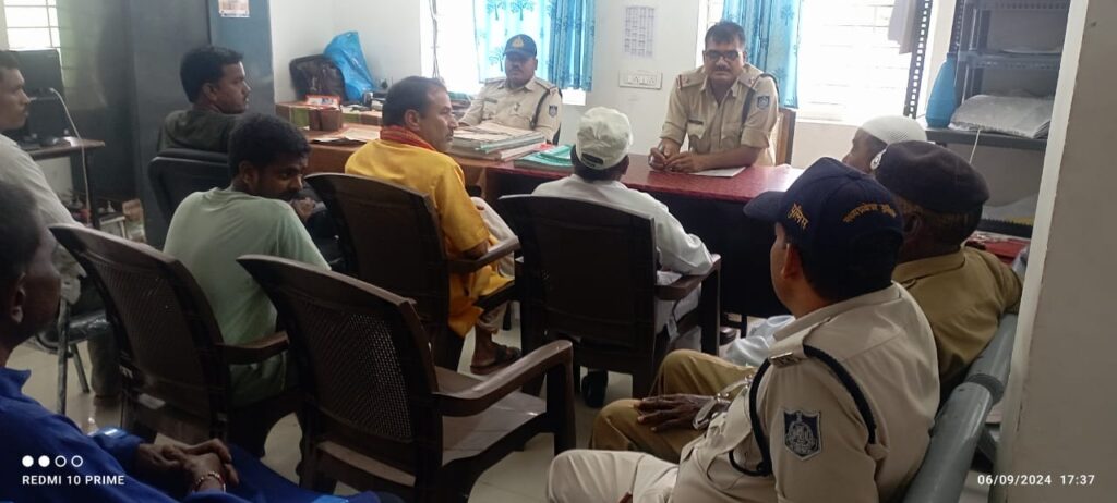 शांति समिति के मीटिंग की अध्यक्षता कर रहे , ए. एस.आई. रामेश्वर पांडे ने उपस्थित समिति के सदस्यों से रूबरू बात की और गणेश चतुर्थी तथा ईद मिलादुन्नबी त्यौहार के चलते किसी तरह का कोई अप्रिय घटना ना घटे इसके लिए सुझाव मांगा गया, सुझाव में उपस्थित सदस्यों ने सुझाव दिया पंडाल में किसी तरह का करेंट लीकेज नहीं होनी चाहिए, क्योंकि बरसात का मौसम है ध्यान रखने की आवस्यकता है,गणेश विसर्जन एक दिन किये जाने की सुझाव दिया गया,प्रसाद वितरण में रोड को बाधित कर ना किया जाए, आवागमन अवरुद्ध न हो ध्यान रखा जाए, गणेश जी