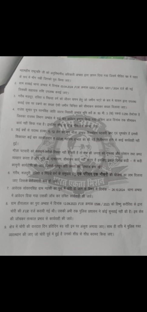 रैली के बाद कार्यकर्ताओं ने एसडीएम कार्यालय पहुंचकर मुख्यमंत्री के नाम नायब तहसीलदार को ज्ञापन सौंपा। ज्ञापन में यह आरोप लगाया गया कि अंबाह क्षेत्र में बहुजन समाज के लोगों पर लगातार जुल्म, अत्याचार और हत्याएं की जा रही हैं। कार्यकर्ताओं ने कहा कि प्रशासन की निष्क्रियता और मदद न मिलने के कारण दबंगों के अत्याचारों से समाज के लोग परेशान हैं।