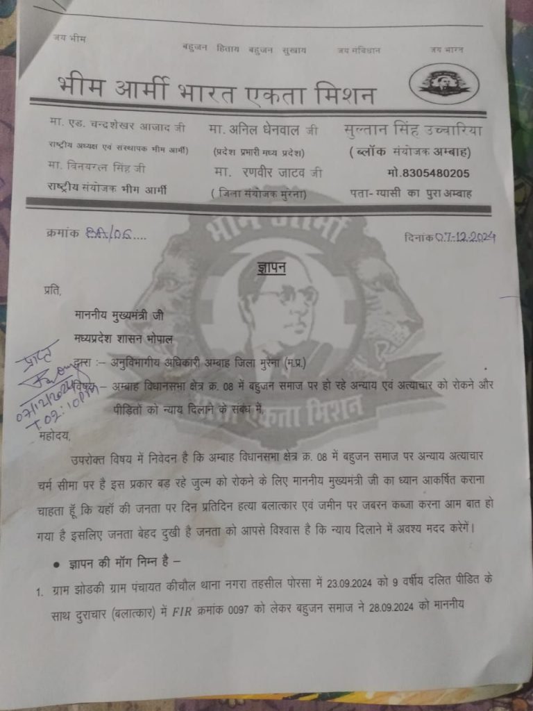 अंबाह विधानसभा क्षेत्र में दलित समुदाय पर हो रहे अत्याचार के खिलाफ आज भीम आर्मी एकता मिशन ने एक शक्तिशाली विरोध प्रदर्शन किया। शनिवार दोपहर लगभग 2 बजे, बड़ी संख्या में कार्यकर्ता स्थानीय रेस्ट हाउस पर एकत्रित हुए और फिर पुलिस व प्रशासन के खिलाफ नारेबाजी करते हुए एसडीएम कार्यालय की ओर रैली निकाली। इस दौरान कार्यकर्ताओं ने इलाके में बढ़ते अत्याचारों के खिलाफ आवाज उठाई और प्रशासन से ठोस कार्रवाई की मांग की।