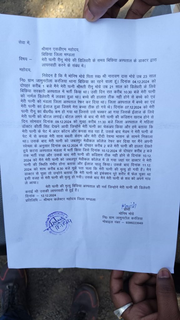 मंडला जिले के बिछिया विकासखंड अंतर्गत सरकारी अस्पताल पर 4 दिसंबर को नॉर्मल डिलीवरी के ठीक 7 दिन बाद महिला की जबलपुर (मेडिकल )में इलाज के दौरान मौत हो गई l बताया गया कि मोनिष मोग्रे पिता नारायण दास मोग्रे उम्र 23 साल निवासी जामुन टोला करंजिया बिछिया के द्वारा 4 दिसंबर को उसकी पत्नी रीनू मोग्रे को गर्भावस्था में बिछिया अस्पताल लेकर आया गया था l जहाँ उसी रात 10:30 बजे महिला के प्रसव दौरान लड़का हुआ l बच्चे की हालत नाजुक होने के वजह से महिला -बच्चे को जिला अस्पताल रेफर कर दिया गया l