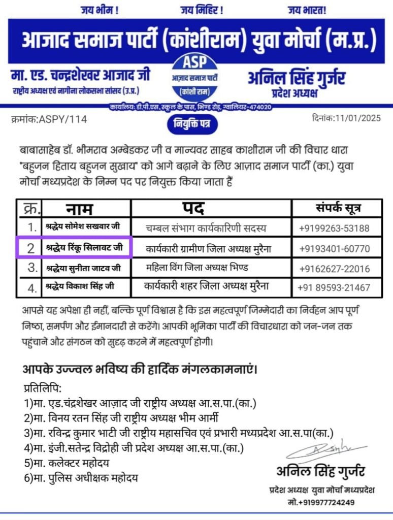 आजाद समाज पार्टी (भीम आर्मी) के संघटन के शीर्ष नेतृत्व ने इन्जी. रिंकू सिलावट को मुरैना जिले का युवा मोर्चा अध्यक्ष नियुक्त किया है। रिंकू सिलावट, जो कि अनुसूचित जाति के सखवार समाज से आते हैं, समाज और मानवता की भलाई के लिए सक्रिय रूप से काम कर रहे हैं। हालांकि उन्हें राजनीति और समाज सेवा में अधिक समय नहीं हुआ है, लेकिन उनके कार्यों ने तेजी से ध्यान आकर्षित किया है।