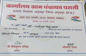 जनपद पंचायत अनूपपुर अन्तर्गत ग्राम पंचायत परासी में धूमधाम से गणतंत्र दिवस समारोह मनाया गया ग्राम पंचायत परासी के नवनिर्वाचित सरपंच श्रीमती राधा सिंह द्वारा ध्वजारोहण किया गया एवं एक अनूठी पहल करते हुए वरिष्ठ जनों का सम्मान करते हुए उन्हें ग्राम रत्न पुरस्कार से नवाजा गया। सरपंच द्वारा गांव में पहली बार ग्राम रत्न पुरस्कार का आयोजन किया गया जहाँ ग्राम रत्न के रूप में वर्तमान विधायक एवं पूर्व मंत्री बिसाहू लाल सिंह, खंड चिकित्सा अधिकारी डाक्टर धनीराम सिंह श्याम, डाक्टर मुकेश रवि , पूर्व सरपंच बीरेंद्र सिंह,पेशा एक्ट अध्यक्ष भेलन सिंह,कन्या आश्रम माध्यमिक विद्यालय एवं हाई स्कूल प्राचार्य, पूर्व सरपंच सूर्यवंश सिंह गांव के लोहार मंगल विश्वकर्मा, लल्ला नपित, गांव के अहीर द्वारिका यादव, गांव के कोटवारीन बचनी पनिका एवं जिन्होंने गांव कि सेवा की या फिर गांव का नाम रोशन किया या फिर गांव को एक नई दिशा दिखाया ऐसे कुल 25 लोगो को पुरस्कार से सम्मान दिया गया,, एवं सरपंच द्वारा पुरे गांव में पढने वाले बच्चे कक्षा 1 से 10 वी तक के बच्चों को स्लेट बत्ती, पहाड़ा, कॉपी, पेन, पेंसिल, रबर, कटर, सामान्य ज्ञान पुस्तक एवं बैग वितरित किया गया जिसका सम्पूर्ण ग्राम वासिंयो ने सराहना करते हुए कहा कि गांव में पहली बार ऐसे कार्यक्रम आयोजित किए गए हैं। उक्त कार्यक्रम में प्रमुख रूप से जनपद उपाध्यक्ष तेजभान सिंह, सचिव शिव कुमार, समाजसेवी पंकज सिंह श्याम,पंचगण एवं गांव के वरिष्ठ नागरिक मौजूद रहे।