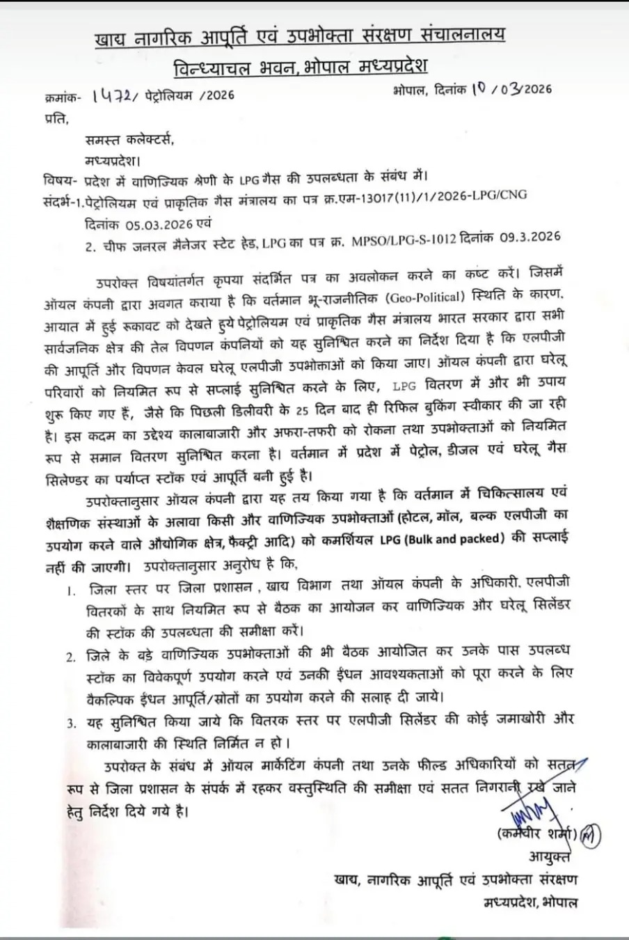 खाद्य, नागरिक आपूर्ति एवं उपभोक्ता संरक्षण संचालनालय, मध्यप्रदेश ने प्रदेश के सभी जिलों को निर्देश जारी करते हुए वाणिज्यिक श्रेणी के एलपीजी गैस सिलेंडरों की आपूर्ति को लेकर अहम आदेश जारी किया है। वर्तमान वैश्विक भू-राजनीतिक परिस्थितियों के कारण एलपीजी के आयात में आई बाधा को देखते हुए यह निर्णय लिया गया है।