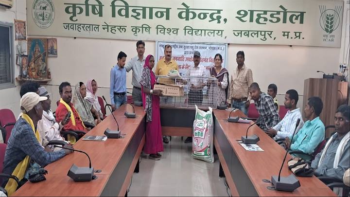राष्ट्रीय उच्च सुरक्षा पशुरोग संस्थान भोपाल द्वारा प्रायोजित अनुसूचित जनजाति उपयोजना अंतर्गत वित्तपोषित ग्रामीण उद्यमिता के लिए मुर्गीपालन विषय पर आधारित कृषक संगोष्ठी एवं आदान सामग्री वितरण कार्यक्रम का आयोजन कृषि विज्ञान केंद्र शहडोल में किया गया। कार्यक्रम में संयुक्त संचालक कृषि शहडोल श्री जे एस पेन्द्राम ने कहा कि भारत एक कृषि प्रधान देश है जहाँ गाँवों की प्रधानता है। जीविकोपार्जन का मुख्य साधन कृषि के साथ-साथ कृषि आधारित व्यवसाय जैसे पशुपालन, कुक्कुट पालन, डेयरी उद्योग, फल उत्पादन, मशरूम उत्पादन इत्यादि हैं। गाँवों की अधिसंख्यक आबादी सीमांत व लघु कृषक अथवा भूमिहीन श्रमिकों की है जिनको गाँव में पर्याप्त रोजगार न होने के कारण शहरों की तरफ पलायन करना पड़ता है। उन्होंने कहा कि वर्तमान आर्थिक परिवेश में खेती के साथ-साथ अन्य व्यवसायों को अपनाना गाँवों के विकास के लिए नितांत आवश्यक है। कुक्ुकट पालन व्यवसाय ग्रामीण एवं शहरी क्षेत्र के बेरोजगार नवयुवकों को रोजगार उपलब्ध कराने की दृष्टि से अत्यंत महत्वपूर्ण है। केंद्र के वरिष्ठ वैज्ञानिक सह प्रमुख डॉ. मृगेंद्र सिंह ने किसानों को बताया कि भारत में विश्व की सबसे बड़ी कुक्कुट आबादी है, अधिकांश कुक्कुट आबादी छोटे, सीमान्त और मध्यम वर्ग के किसानों के पास है। भारत में ग्रामीण क्षेत्रों में कुक्कुट पालन से किसानों की आय में बढ़ोत्तरी तथा पोषण व खाद्य सुरक्षा की सुनिश्चितता आदि अनेक फायदे हैं। माँस व अण्डों का प्रबन्धन करना तथा किसानों की आर्थिक स्थिति सुदृढ़ करने के उद्देश्य से यह प्रशिक्षण आयोजित किया जा रहा है। कार्यक्रम के नोडल अधिकारी डॉ. ब्रजकिशोर प्रजापति ने किसानों को बताया कि मुर्गीपालन कम पूंजी में शुरू होने वाला लाभकारी व्यवसाय है, जिससे ग्रामीण क्षेत्रों में रोजगार के नए अवसर सृजित हो सकते हैं। वैज्ञानिक तरीके से मुर्गीपालन अपनाने पर कम समय में अच्छी आय अर्जित की जा सकती है साथ-साथ मुर्गी का मल का उपयोग बटन मशरूम उत्पादन हेतु कम्पोस्ट बनाने तथा खाद के रूप में खेतो में प्रयोग से फसल की उत्पादकता में बढ़ोत्तरी होती है। भारत में कुपोषण एवं गरीबी की समस्या को दूर करने के लिए पारम्परिक मुर्गी पालन अथवा घर के पिछवाड़े मुर्गी पालन की यह पद्धति प्राचीन काल से प्रचलित है। इसमें प्रायः 5-20 मुर्गियों का छोटा सा समूह एक परिवार के द्वारा पाला जाता है, जो घर एवं उसके आस-पास में अनाज के गिरे दाने, झाड़-फूसों के बीच कीड़े-मकोड़े, घास की कोमल पत्तियाँ तथा घर की जूठन आदि खाकर अपना पेट भरती है। इसके रात्रि विश्राम के लिए घर के टूटे-फूटे भाग व खंडहर काम में लाए जाते है। इस प्रकार घर के रखरखाव एवं खाने-पीने पर कोई खास खर