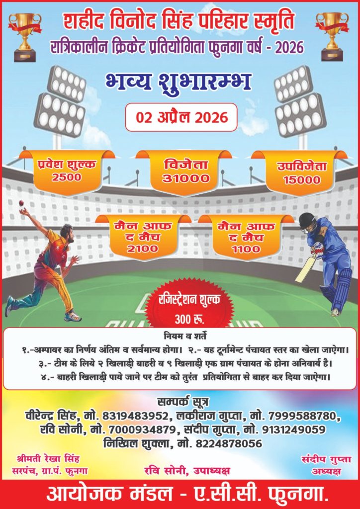 फुनगा ग्राम पंचायत में 02 अप्रैल 2026 को शहीद विनोद सिंह परिहार स्मृति रात्रिकालीन क्रिकेट प्रतियोगिता का भव्य शुभारंभ किया गया। इस टूर्नामेंट का आयोजन ए.सी.सी. फुनगा द्वारा किया जा रहा है, जिसका उद्देश्य खेल और सामुदायिक सहभागिता को बढ़ावा देना है।
