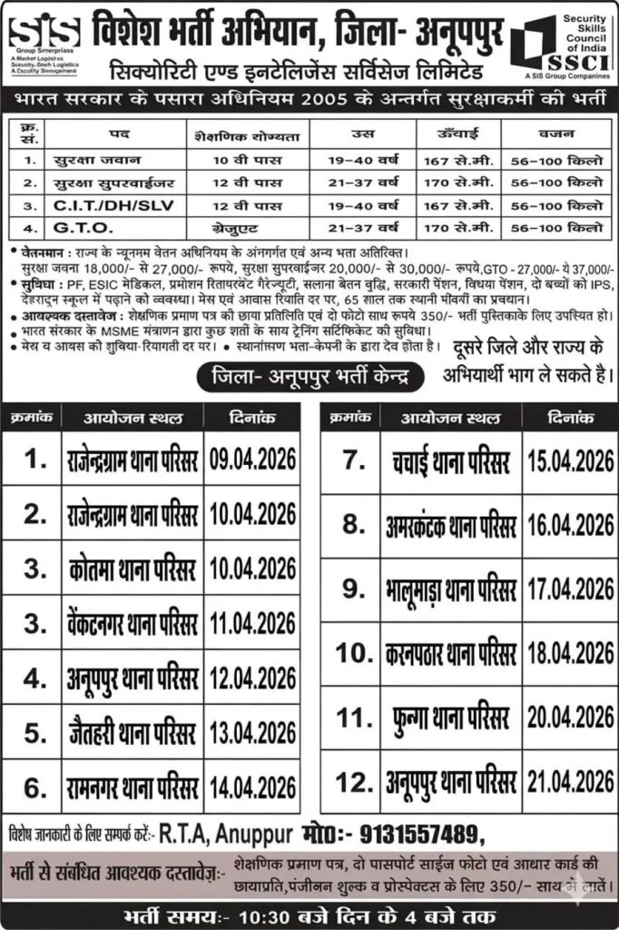 जिले के शिक्षित बेरोजगार युवाओं के लिए रोजगार का सुनहरा अवसर सामने आया है। एस.आई.एस. लिमिटेड, अनूपपुर द्वारा विभिन्न सुरक्षा पदों पर भर्ती के लिए 9 अप्रैल से 21 अप्रैल 2026 तक विशेष शिविरों का आयोजन किया जा रहा है। इन शिविरों में अभ्यर्थियों का पंजीयन कर उन्हें प्रशिक्षण दिया जाएगा, जिसके बाद स्थायी रोजगार उपलब्ध कराया जाएगा।