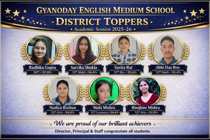 एमपी बोर्ड के शैक्षणिक सत्र 2025-26 के परीक्षा परिणामों में शहडोल जिले के ज्ञानोदय इंग्लिश मीडियम स्कूल के विद्यार्थियों ने उत्कृष्ट प्रदर्शन करते हुए जिले में अपना परचम लहराया है। विद्यालय के कई छात्र-छात्राओं ने विभिन्न संकायों में उच्च अंक प्राप्त कर जिला टॉपर बनने का गौरव हासिल किया।